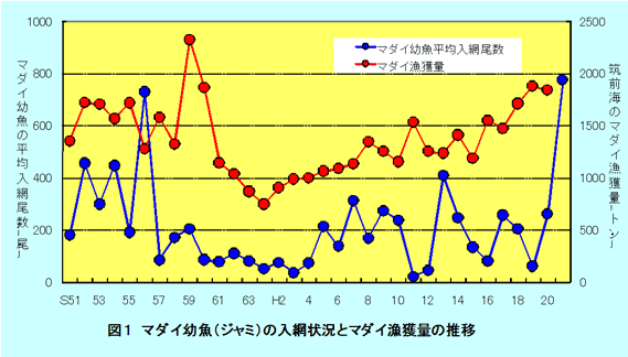 平成19年は減少傾向にあったマダイ幼魚(ジャミ)資源は,昨年と本年の調査では増加傾向を示しています。本年の平均入網尾数は776尾で,過去最高の昭和56年と同レベルです。