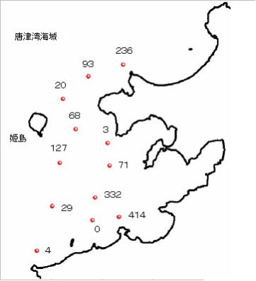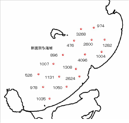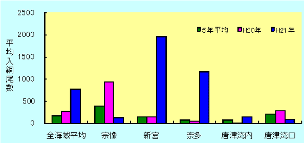 各海域の調査定点は6〜9点の計34点で,平均入網尾数は,1網当たり採捕されたマダイ幼魚の平均尾数を示しています。海域別では,宗像海域が昨年より減少したものの新宮・奈多海域では大幅に増加しました。唐津湾海域では,湾口は減少していますが湾内は増えています。