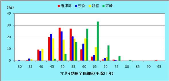 採補されたマダイ幼魚の全長組成をみると,唐津湾海域では45〜55mmを,奈多及び新宮海域では45〜60mmを,宗像海域では55〜70mmを中心とした群がみられました。